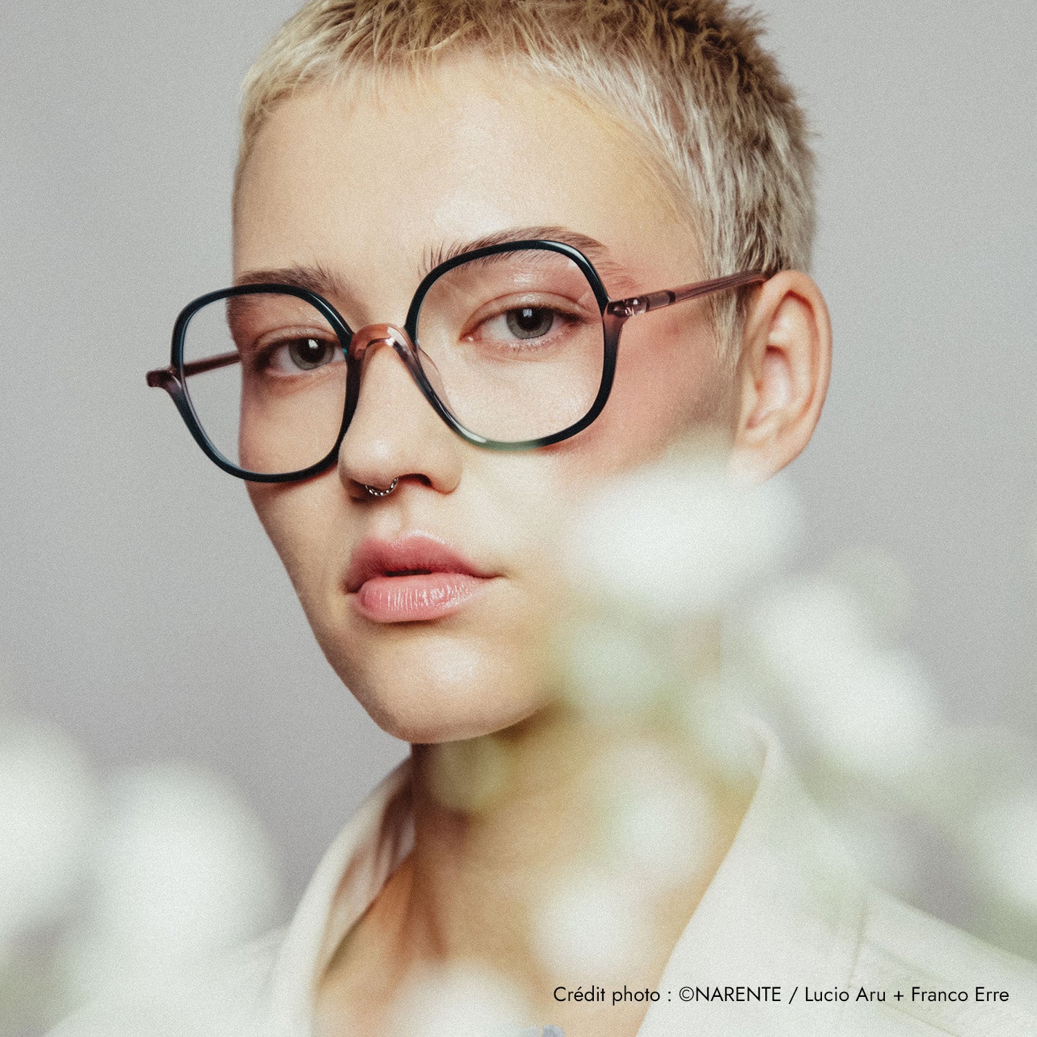 Cette sensibilité se reflète dans les montures créées en collaboration avec MOREL, où les nuances de lumière et d’ombre jouent avec subtilité, évoquant la délicatesse d’un mot soigneusement écrit.