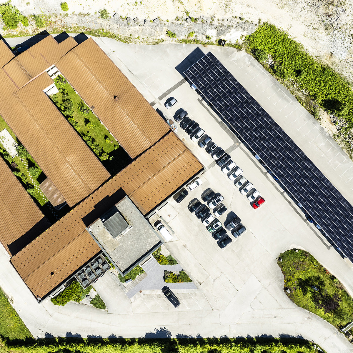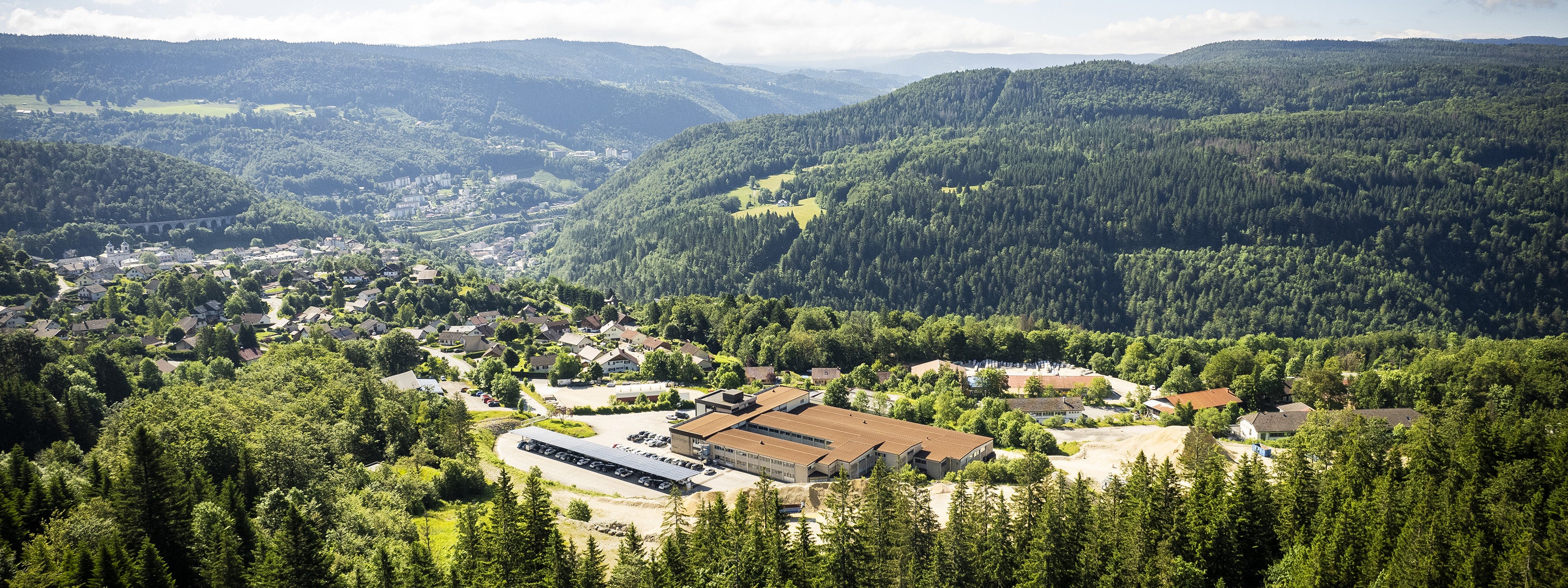Nous avons installé des ombrières photovoltaïques ainsi que des bornes de recharge pour véhicules électriques sur le parking de notre entreprise à Morbier, Jura.