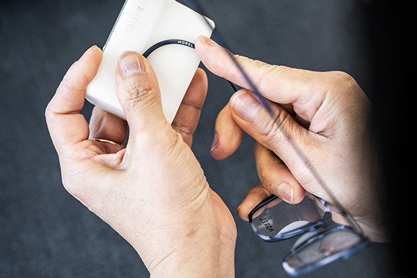 Nous utilisons des sachets biodégradables pour emballer nos montures et optimisons au maximum la taille de nos étuis. La chiffonnette accompagnant chaque monture est en textile recyclé et les emballages utilisés pour l’envoi de nos produits sont en carton recyclé.